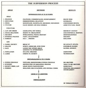 revolution, he argued for the slow seizure of “cultural hegemony”: media, education, religion, morals,